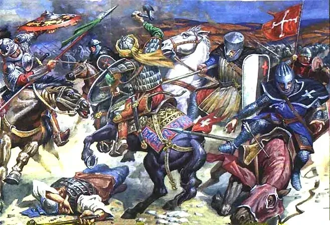 エルサレム王国の国王ギ·ド·リュジニャンは喉が渇いた、暑かった、厳しい演技で目まで辛かった。 近くにガリラヤ湖があった。 彼は今すぐガリラヤ湖に身を投げたかったが、行くことができなかった。 すでにサラディンの軍隊が四方を取り囲んでいたためだった。 エルサレム王国軍の騎士たちは必死に包囲網を突破しようとした。 国王近衛隊もサラディン軍の攻撃に必死に抵抗した。 しかし、彼らはサラディン軍の剣の下で倒れていった。